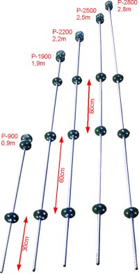 Para estructuras inclinadas combinar patas de soporte: (P-2800/P-2200)(P-2500/P-1900). Tramo de 30cm para clavar en tierra o en la base de hormigón o hierro.